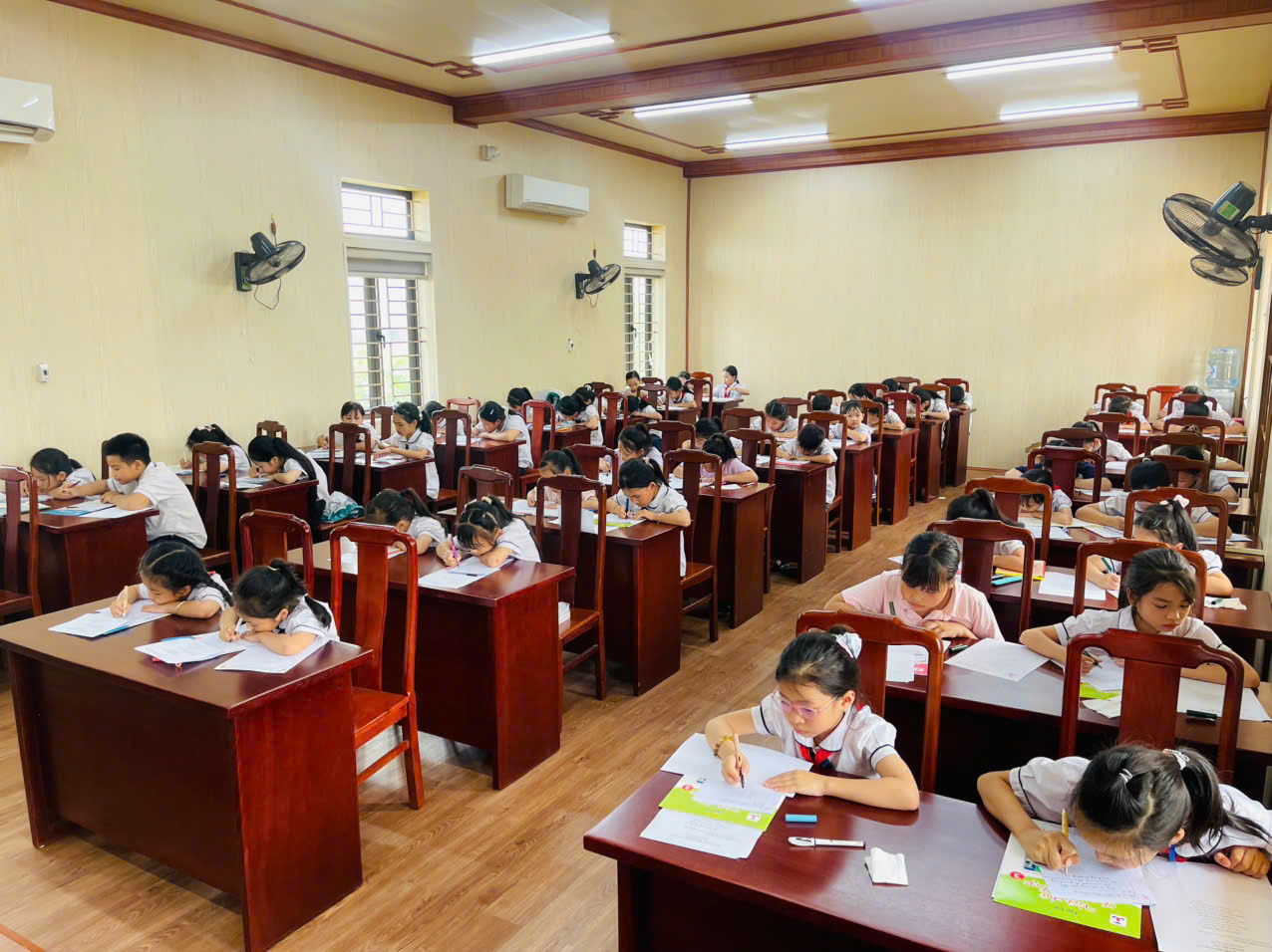 Trước giờ khảo sát, các em có chút lo lắng, tay hơi run, nhưng khi bắt đầu viết, các em dần bình tĩnh lại và tập trung cao độ vào từng nét chữ. Không gian phòng khảo sát yên tĩnh, chỉ còn lại tiếng bút sột soạt trên giấy khiến các em càng ý thức hơn về sự cẩn thận và tỉ mỉ.